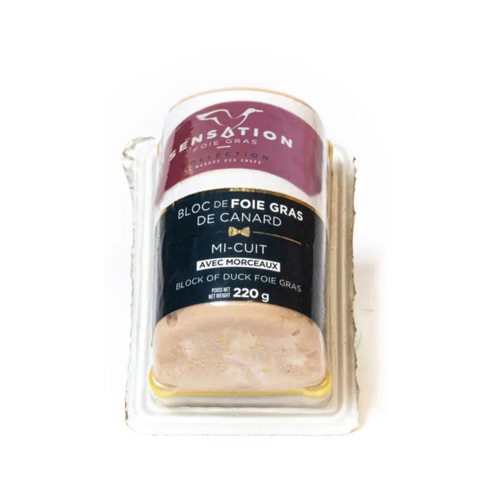 Succombez au bloc de foie gras de canard 30 % morceaux en barquette de 220 g de Sensation Foie Gras. Parfait pour des moments gourmands à deux ou des entrées élégantes, ce foie gras allie douceur et texture.